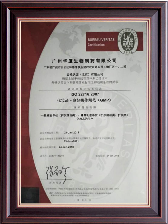 公司始創(chuàng)建于2012年,經(jīng)過八年的健康發(fā)展,已經(jīng)成為可以從事妝字號、消字號、械字號等系列產(chǎn)品生產(chǎn)加工的大型企業(yè)。企業(yè)坐落在美麗的廣州白云區(qū)鐘樓潭鎮(zhèn),擁有面積超過15,000平方米的生產(chǎn)廠房。廠房寬敞明亮,設(shè)計科學(xué)新進(jìn),擁有十萬級的生產(chǎn)車間,局部環(huán)境可以達(dá)到一萬級別;設(shè)備多采用新進(jìn)的進(jìn)口設(shè)備,自動化程度非常高,擁有一流的生產(chǎn)設(shè)施。工廠同時通過了ISO22716和GMCP質(zhì)量管理認(rèn)證,擁有一流的質(zhì)量管理體系。廠